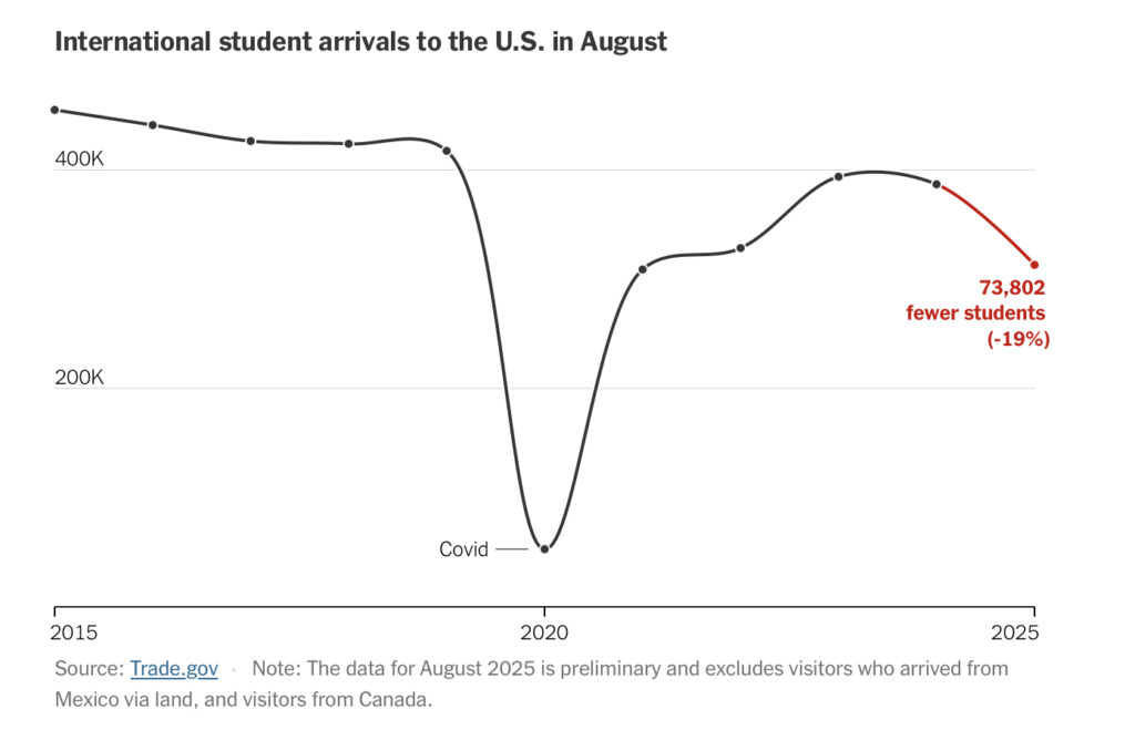 En agosto de 2025 ingresaron a EE. UU. entre un 19 y 20 por ciento menos estudiantes internacionales que un año antes — la mayor caída en la historia fuera de la pandemia, según análisis del NYT. Universidades como DePaul reportan un descenso del 30 % en su alumnado extranjero. Las causas: políticas más duras, demoras y visados denegados durante lo que va de la segunda administración Trump.