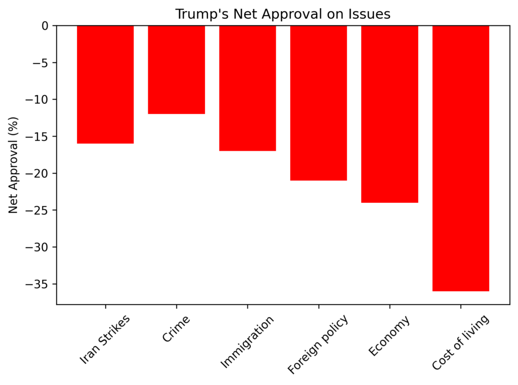 El dato es políticamente delicado. En otra medición nacional reciente, la aprobación general del presidente se mantiene negativa (60% desaprueba frente a 38% aprueba), con una brecha notable entre independientes, donde la desaprobación supera ampliamente el respaldo. En un contexto electoral polarizado, el margen entre votantes no afiliados podría resultar decisivo.