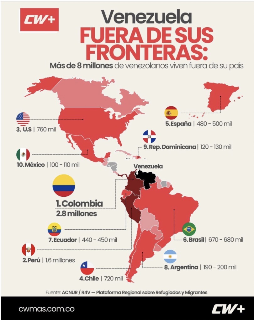 Colombia, Perú, Estados Unidos, Brasil, Chile y España concentran la mayor parte de ese éxodo. Pero la cifra, por sí sola, no describe el fenómeno. Lo que realmente ocurrió es que el mapa de Venezuela se ensanchó. El país ya no termina en sus fronteras físicas. Es una nación distribuida.