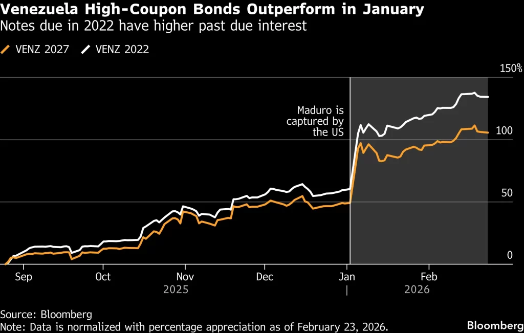 Venezuela’s defaulted sovereign bonds extended their rally this week, with the country’s 2027 notes trading above 47 cents on the dollar, their highest level since 2017. Bonds issued by state oil company PDVSA also posted sustained gains, reflecting growing investor expectations that a sovereign debt restructuring process may eventually become feasible as questions surrounding political recognition begin to resolve.